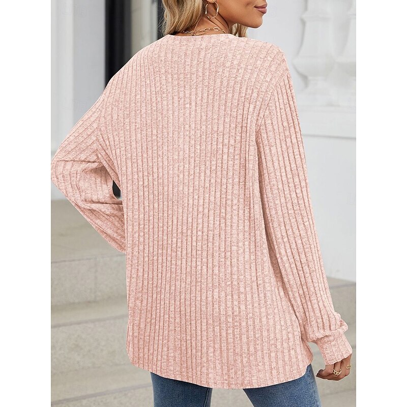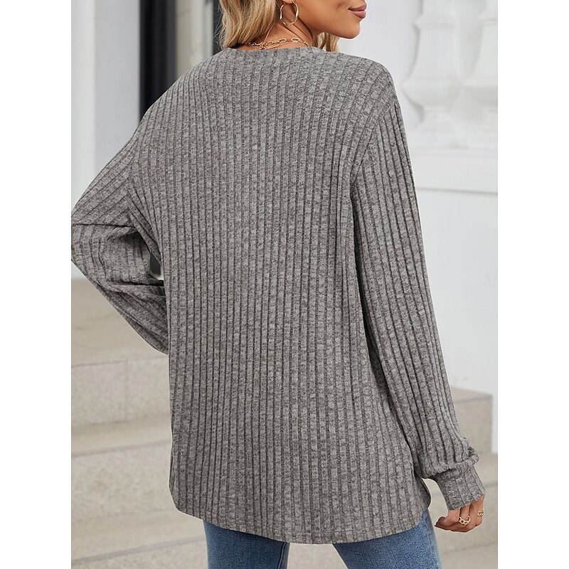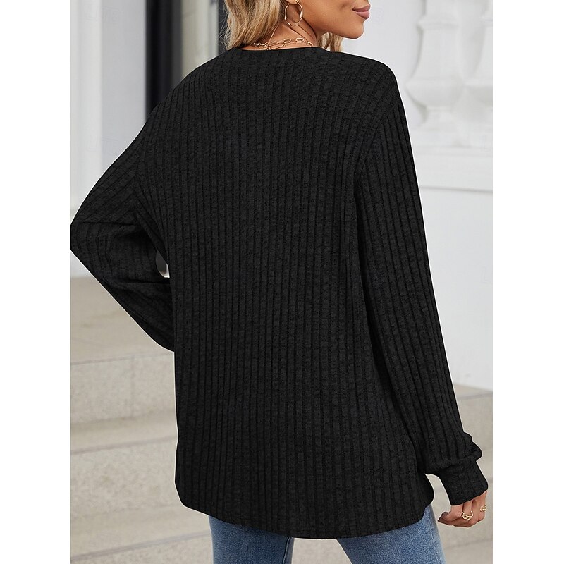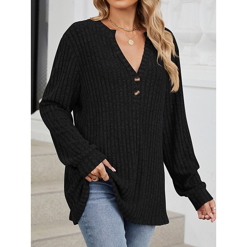 Highlights [Fabric]: Crafted from a cozy blend of polyester and rayon, this women's blouse offers a soft, ribbed knit texture, providing both warmth and micro-elastic comfort for everyday wear. [Fit]: Designed with a loose fit, this blouse allows for a relaxed and comfortable silhouette, making it an ideal piece for transitional seasons like spring and fall. [Design Highlights]: Featuring a notched neckline with fashionable button details, this long-sleeve blouse showcases modern bishop sleeves that are gently gathered at the cuffs, adding a touch of elegance to the overall look. [Occasions]: Perfect for work environments and professional settings, this stylish and modern blouse pairs beautifully with jeans or slacks for a chic, effortless ensemble suitable for various occasions. [Size Range]: Available in sizes S, M, L, XL, and 2XL, this blouse is designed to accommodate a range of body types, ensuring a comfortable and flattering fit for all.