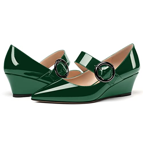 HOT ! WAYDERNS Women's Adjustable Strap Patent Office Pointed Toe Mary Jane Solid Circle Buckle Wedge Low Heel Pumps Shoes 2 Inch