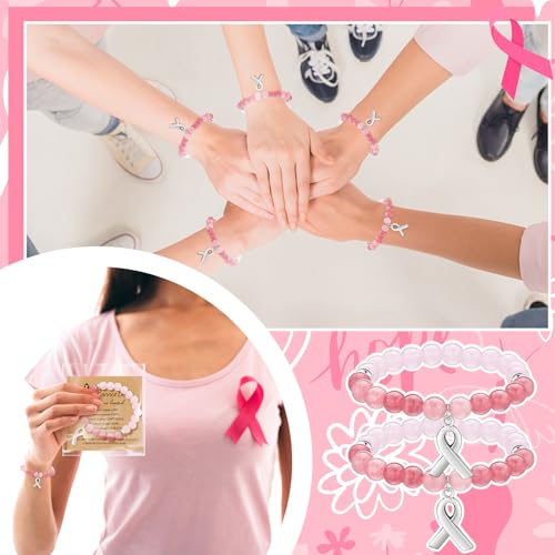 24 Pcs Breast Cancer Awareness Bracelets Team Gift Natural Stone Pink Beaded Bracelet with Inspirational Card for Ribbon Charm Bracelet for Women 6