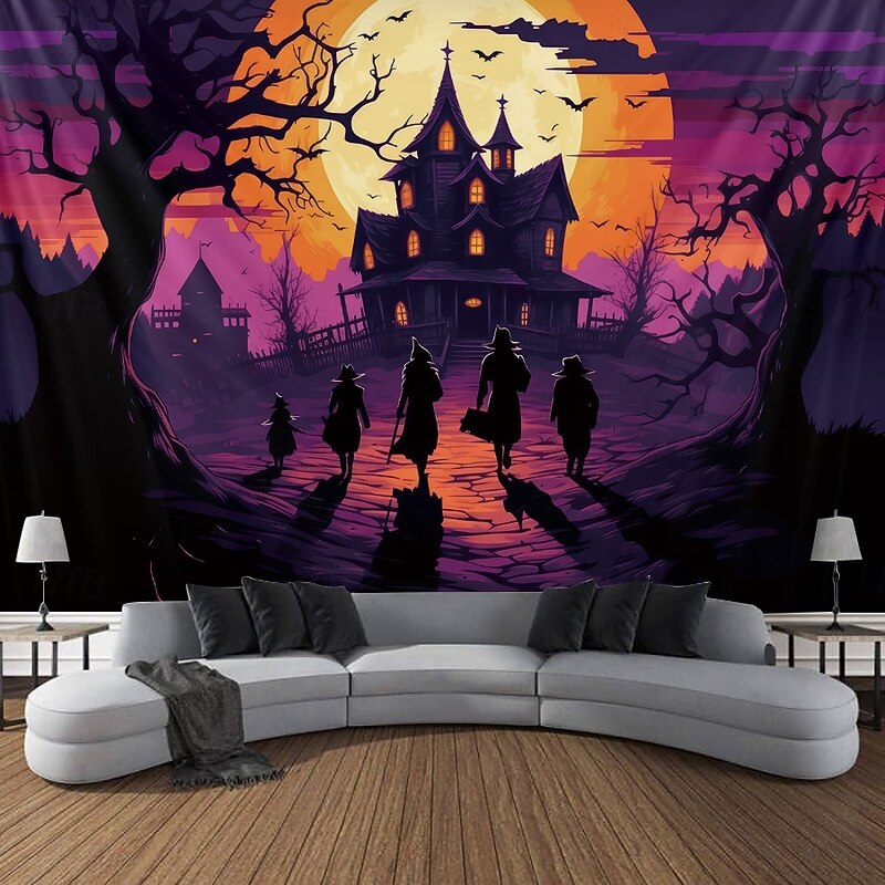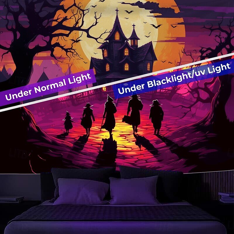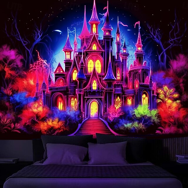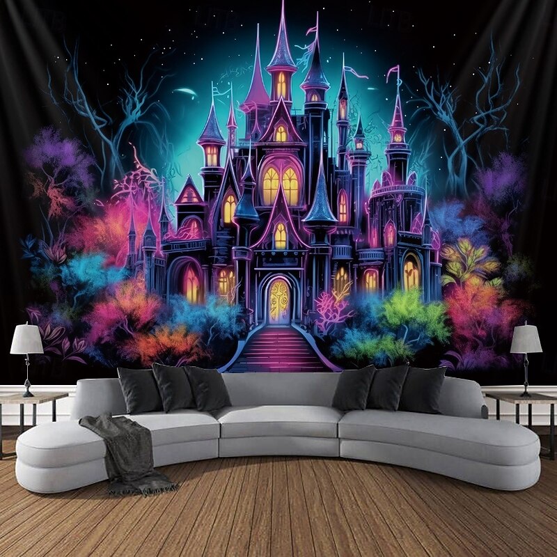 HOT ! Halloween Blacklight Tapestry Haunted Castle UV Reactive Glow in the Dark Glow Party Trippy Misty Haunted House Hanging Tapestry Wall Art Mural for Living Room Bedroom