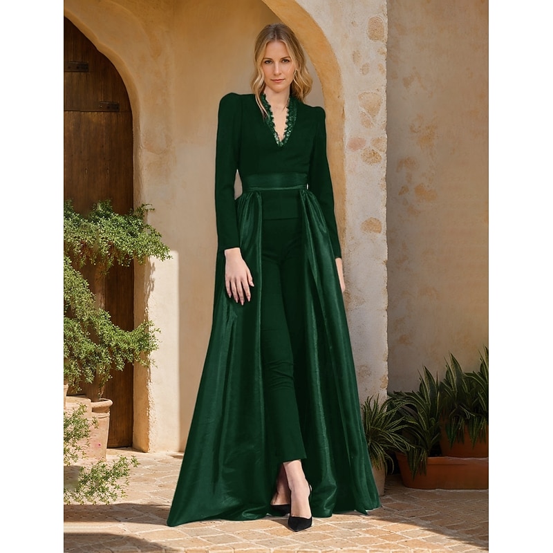 More information about Jumpsuit / Pantsuit Mother of the Bride Jumpsuit Detachable Overskirt Elegant Simple Minimalist V Neck Floor Length Ankle Length Satin Crepe Stretch Fabric Long Sleeve with Lace