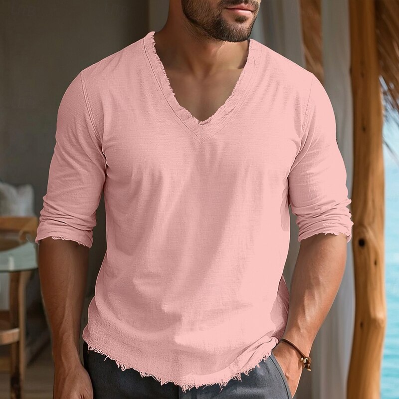 Men's Linen T-Shirt Long Sleeve V Neck Summer Spring Solid Color Plain Vintage Basic Bohemian Raw Edge Vacation Street Casual White Pink Burgundy Top Tee for Men 24