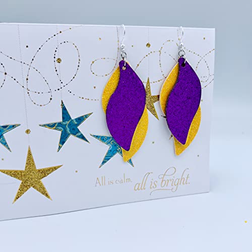 • Purple and gold earrings for university students who would want to sport them for an event. These two-layered faux PU leather glitter college earrings will rock your style at a game. Show your loyalty to your college at a tournament or just style as an everyday accessory. Who wouldn't want the sway & swag of these bright, bold & beautiful danglers. Style one yourself & get one as a gift for your bestie. Stand out in the crowd, the more the merrier. Go team!!