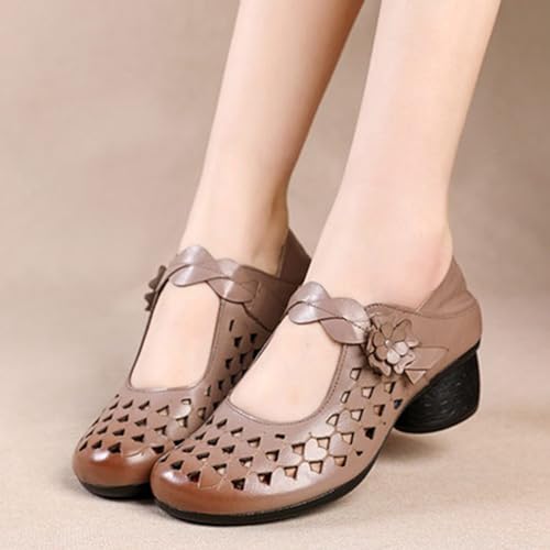 Women's Leather Hollow Out Mary Jane Chunky Heel Pumps,Casual Closed Round Toe Hook & Loop Low Heel Dress Shoes,Comfort Flower Block Heel Sandals 4
