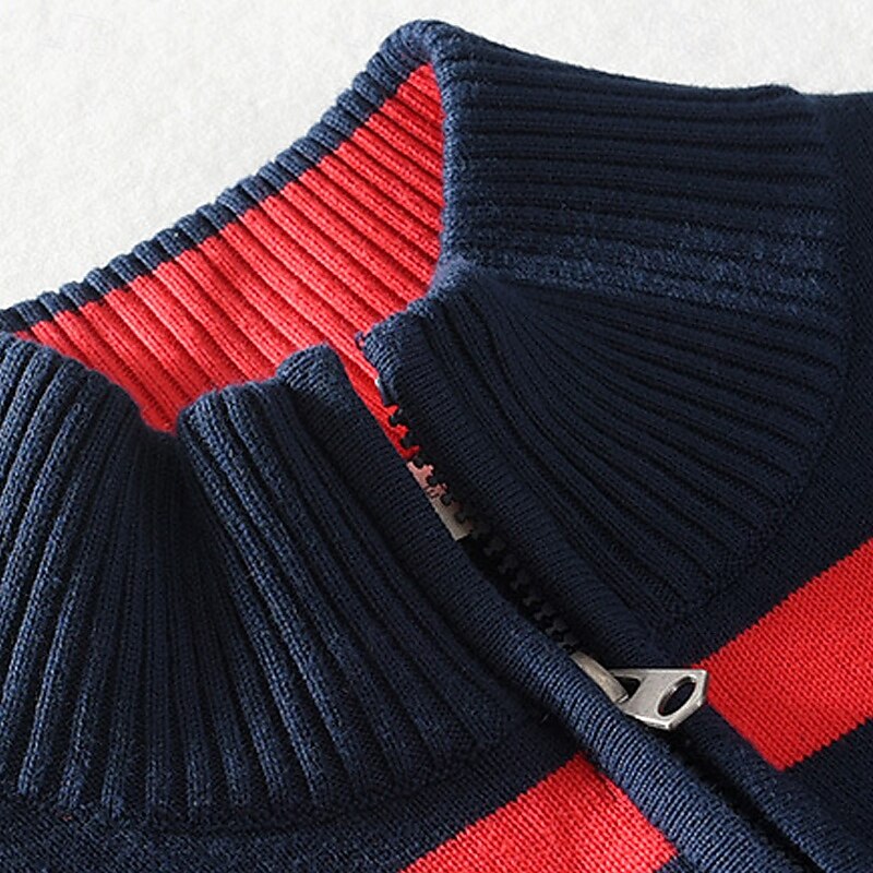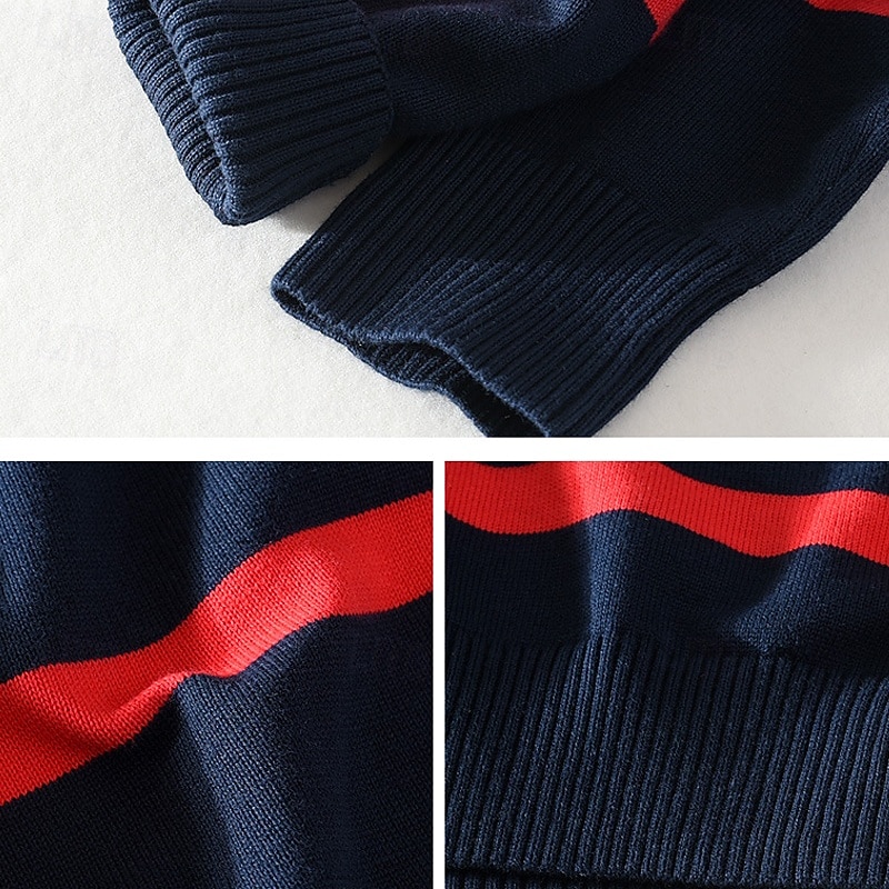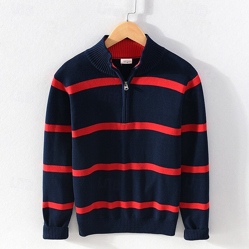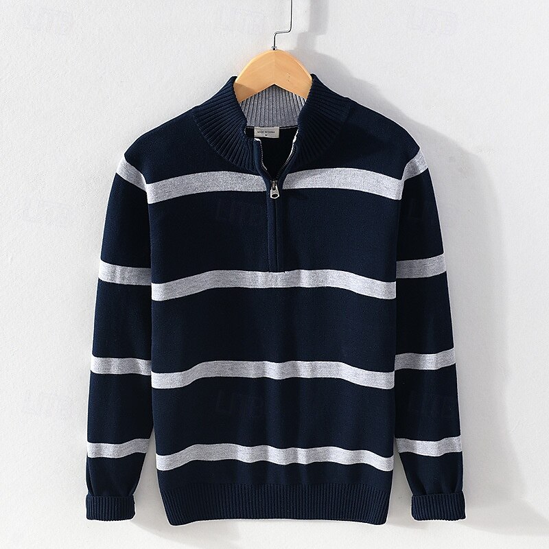 Highlights - Stay stylish and cozy this Fall and Winter with our polyester striped sweater. - Features a turtleneck and zipper design for a trendy touch. - Perfect for daily wear, this casual sweater has a regular fit and chunky knit style. - Long sleeves provide extra warmth, making it a must-have for women.
