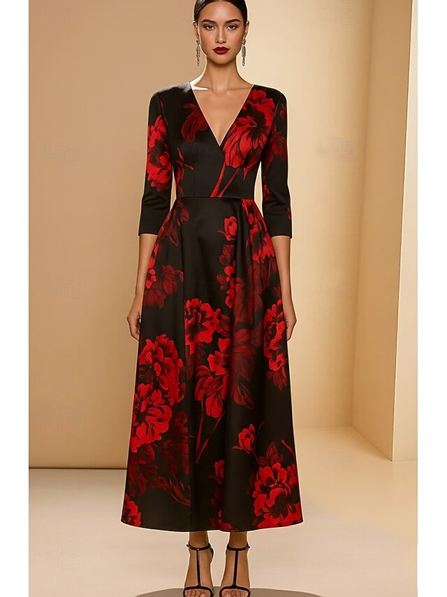 More information about A-Line Cocktail Dresses Elegant Formal Dress Formal Wedding Tea Length 3/4 Length Sleeve V Neck Satin with Floral Print 2025