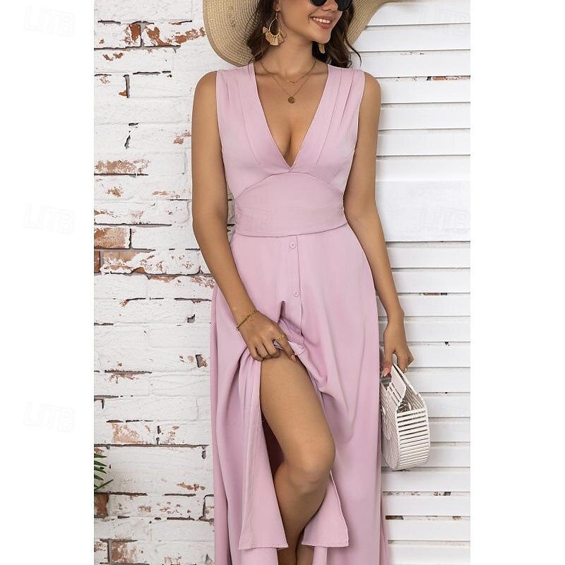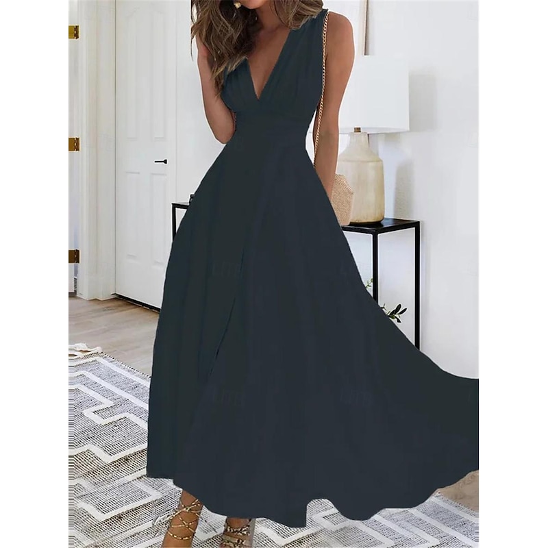 Women's Maxi Dress Elegant White V-Neck Sleeveless Cinched Waist A-Line Formal Evening Wedding Prom Spring Summer Full Size Flattering Fit Clothing Apparel