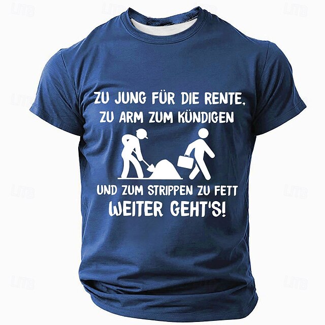 Men's Funny Graphic T-Shirt with German Work Humor Quote: 'Too Young for Retirement, Too Poor to Quit, Too Fat to Strip' 7