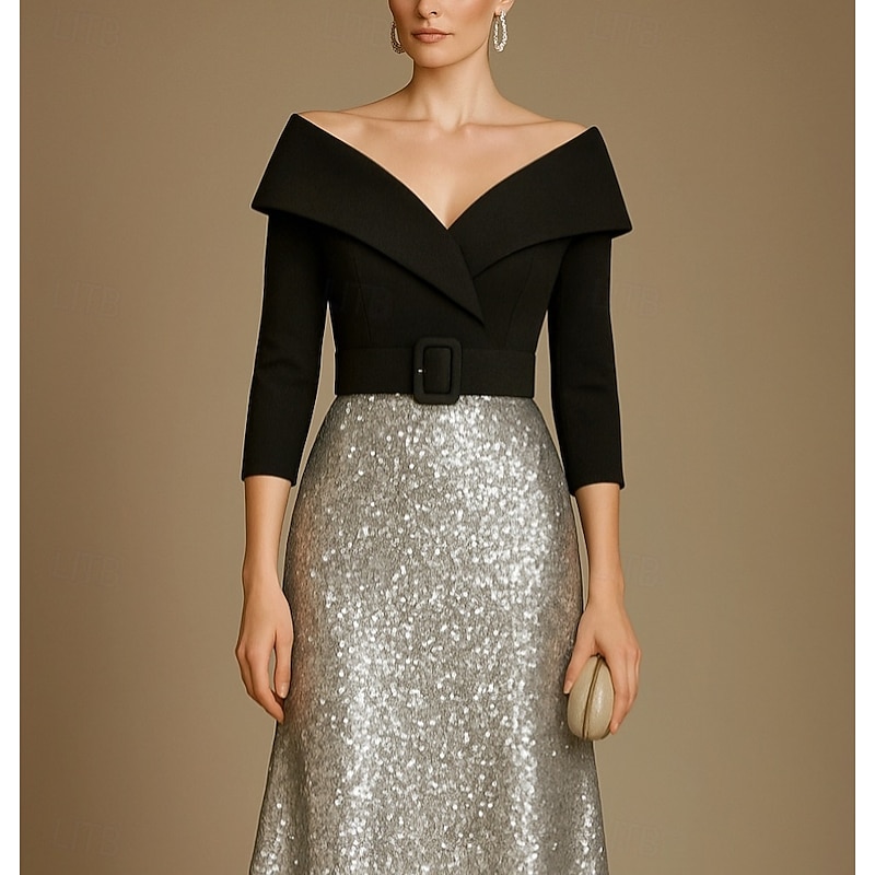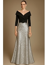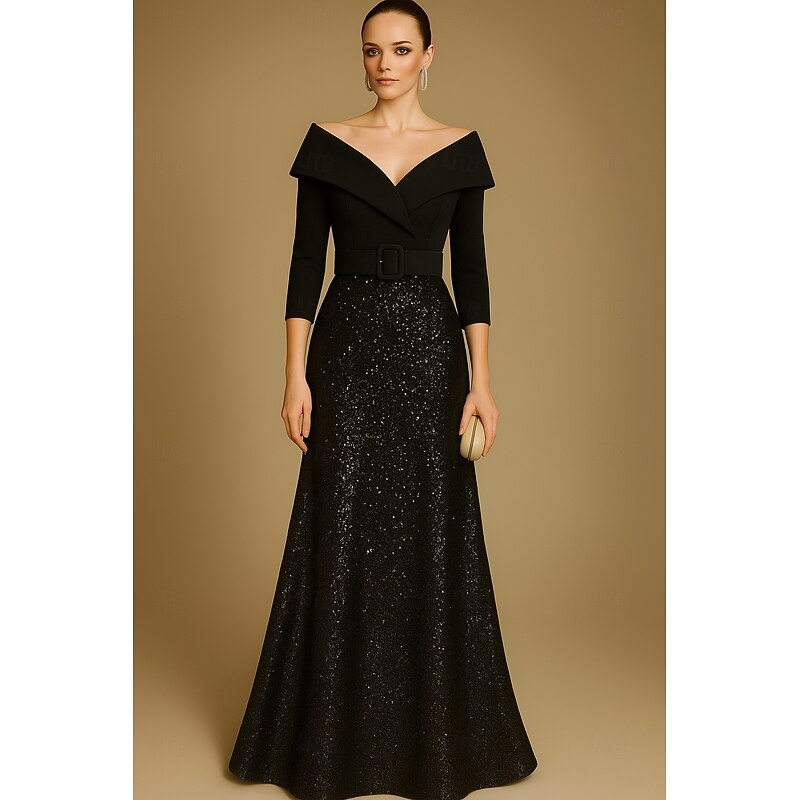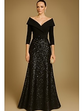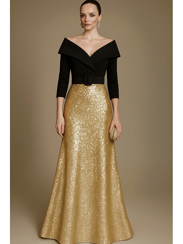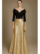 More information about Black Gold Sequined A-Line Evening Gown Elegant Dress Formal Wedding Floor Length Half Sleeve Off Shoulder Velvet with Glitter 2025