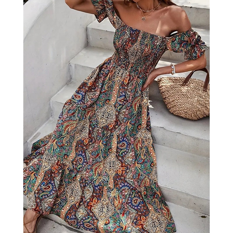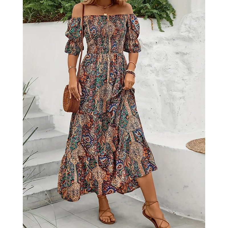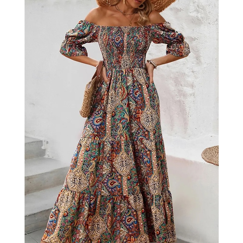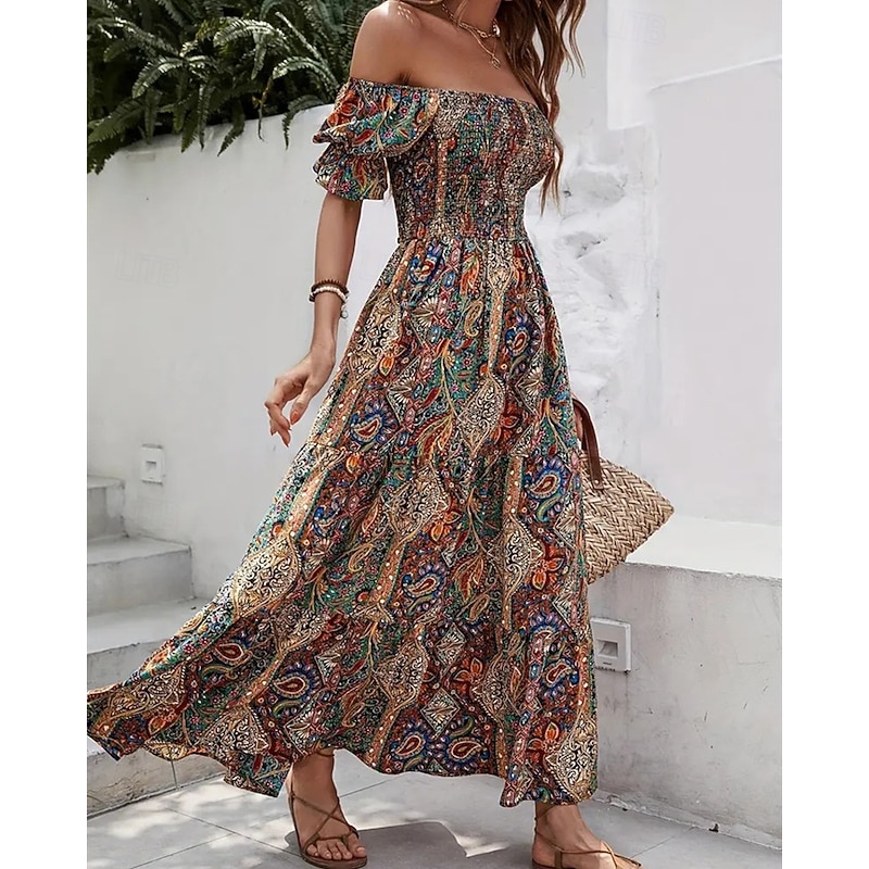 More information about Women's Long Dress Maxi Dress A Line Dress Summer Dress Boho Dress Elegant Bohemia Stylish Vacation Daily Date Regular Fit Graphic Short Sleeve Off Shoulder Green Dark Blue Summer