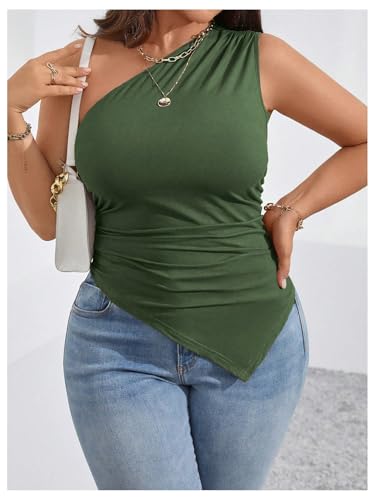 • Feature: Sleeveless, One Shoulder, Solid Color, Ruched, Asymmetrical Hem, Slim Fit, Plus Size Tank Top for Women