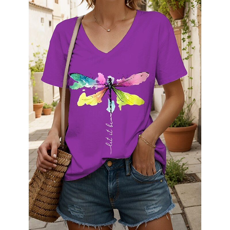 HOT ! Women's T Shirt Graphic Letter Dragonfly Vintage Stylish Classic Short Sleeve V Neck Regular Tops Daily Print White Red Blue Purple Green Summer Spring