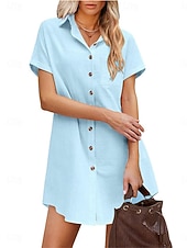 Highlights [Fabric] : Crafted from a breathable blend of cotton and linen, this women's shirt dress offers a comfortable and lightweight feel, perfect for the spring and summer seasons. The fabric ensures a micro-elastic fit, providing ease and flexibility for all-day wear. [Fit] : Featuring a loose fit, this dress drapes elegantly over the body, allowing for freedom of movement and a relaxed silhouette. The short sleeves and mini length make it an ideal choice for warm weather. [Design Highlights] : The dress boasts a classic shirt collar and a functional front button-down closure, highlighting its modern yet timeless style. A convenient chest pocket adds a touch of casual elegance, while prominent buttons enhance its contemporary appeal. [Occasions] : Suitable for a variety of settings, this versatile shirt dress can be worn for casual outings, vacations, or even beachwear. Its simple yet chic design makes it appropriate for both day trips and leisurely date outings. [Size Availability] : Available in a wide range of sizes, from S to 3XL, the dress caters to a variety of body types, ensuring a flattering fit for everyone.