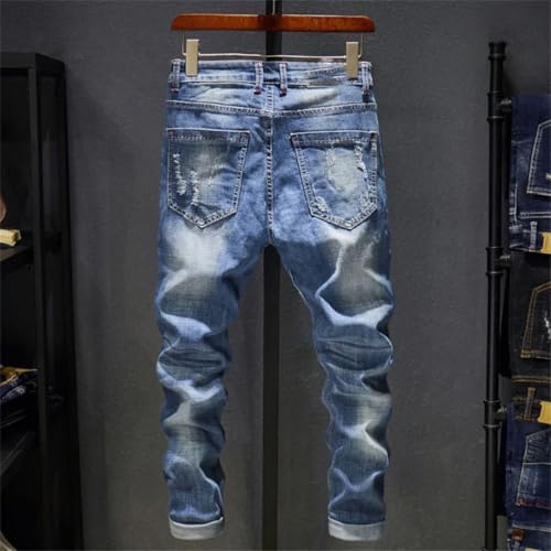 Men Slim Fit Light Blue Stretch Streetwear Frayed Hip Hop Distressed Casual Denim Trousers 5