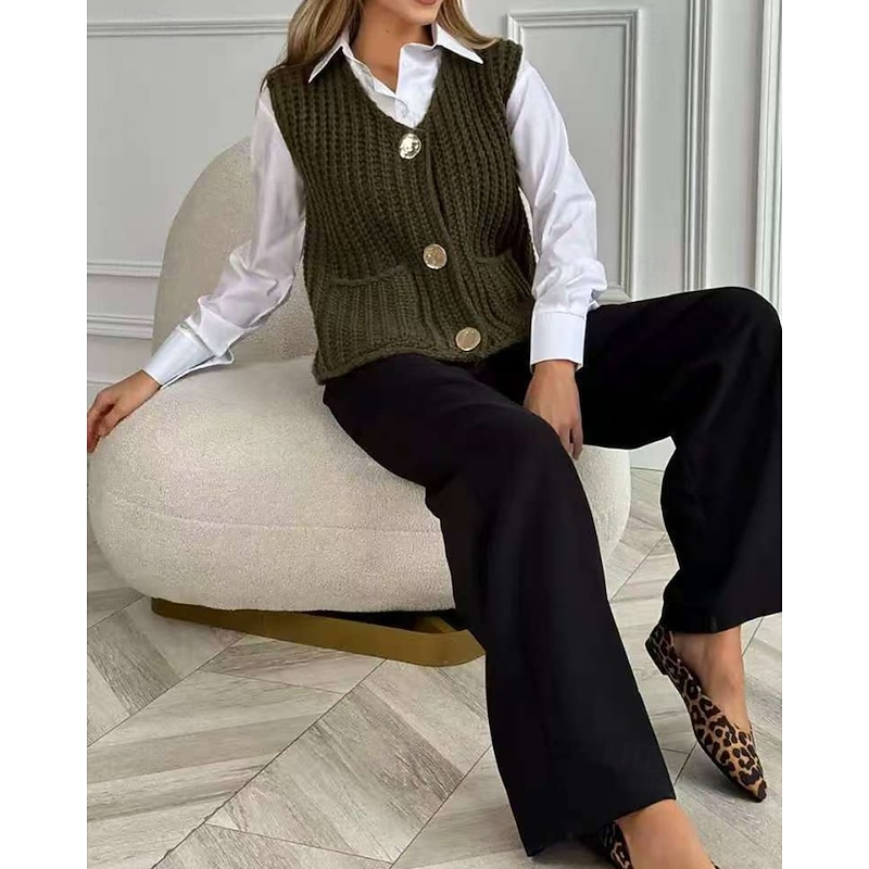 Women's Sweater Sweater Vest Cardigan Streetwear Casual Solid Color V Neck Buttons Knitted Sleeveless Regular Tops Knit Daily Holiday Going out Yellow Pink Fall Winter 10