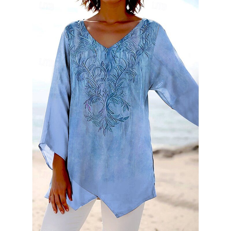 More information about Women's Blouse Long Sleeve Asymmetrical Hem Floral Graphic Stylish Ethnic Beach Short Sleeve V Neck Regular Tops Daily Holiday Print Pink Blue Purple Green Summer Spring
