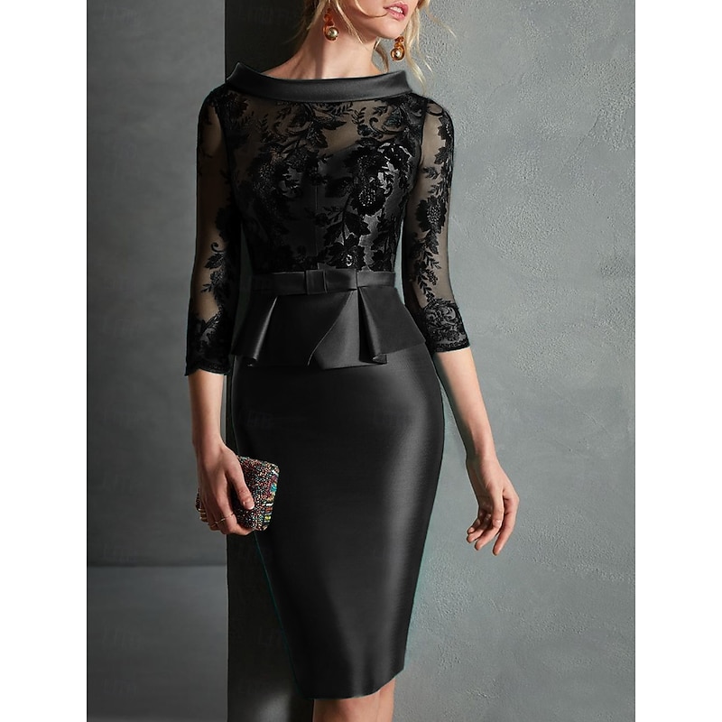Highlights [Fabric] Crafted from luxurious satin, this dress offers a sleek and smooth finish with a touch of elegance. The fabric ensures a comfortable fit, perfect for any formal occasion, while the intricate lace overlay provides a delicate and sophisticated semi-transparent effect on the bodice and sleeves. [Silhouette] The sheath silhouette of this elegant cocktail dress beautifully complements the body’s natural curves. Featuring a fitted waist enhanced by a stylish peplum belt, the design ensures a flattering shape while maintaining a classic and sophisticated profile. [Design Highlights] This dress is adorned with appliques and buttons for an added touch of elegance. The jewel neckline complements the illusion sleeves, highlighting the detailed lace work that exudes sophistication. The knee-length hemline offers a balanced look, merging modesty with elegance. [Occasions] Perfect for a variety of occasions such as cocktail parties, fall weddings, engagements, or Christmas events. This dress is designed to impress at any special gathering, ensuring you leave a lasting impression with its elegant and refined style. [Size Range] Available in a wide range of sizes, including custom measurements, this dress ensures a perfect fit for every body type. Whether you're size US 2 or US 26W, the dress accommodates your specific needs, offering an inclusive and tailored experience for all.