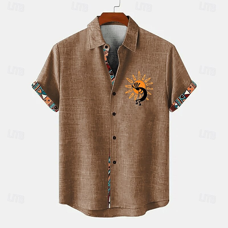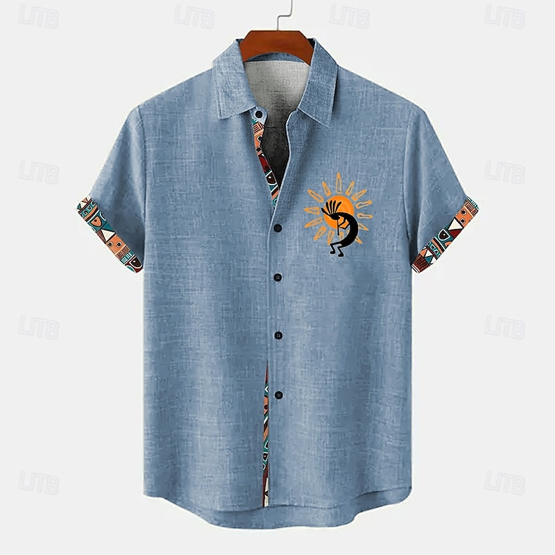 Highlights [Fabric] : Crafted from a blend of 20% Linen, 20% Linen+20% Cellulose, and 60% Polyester, this men's shirt offers a lightweight and breathable feel, perfect for keeping you cool and comfortable during the warm seasons of spring and summer. [Fit] : Designed with a regular fit, this shirt provides comfort for all-day wear, allowing ease of movement without compromising on style. The inelastic nature of the fabric ensures a structured look suitable for various body types. [Design Highlights] : This shirt features a classic button-down front and turndown neckline, offering a traditional yet stylish appeal. The bold design is accentuated by vibrant tribal patterns on the inner placket and sleeve cuffs, with a unique sun and musician motif embellishing the chest area, giving it an artistic and ethnic flair. [Occasions] : Ideal for daily wear, this shirt is versatile enough for both casual outings and festive gatherings. Its stylish design makes it a great choice for summer and spring occasions, adding a pop of color and personality to your wardrobe. [Size Range] : Available in a wide range of sizes from S to XXXL, this shirt is designed to accommodate different body shapes, ensuring a comfortable fit for everyone.