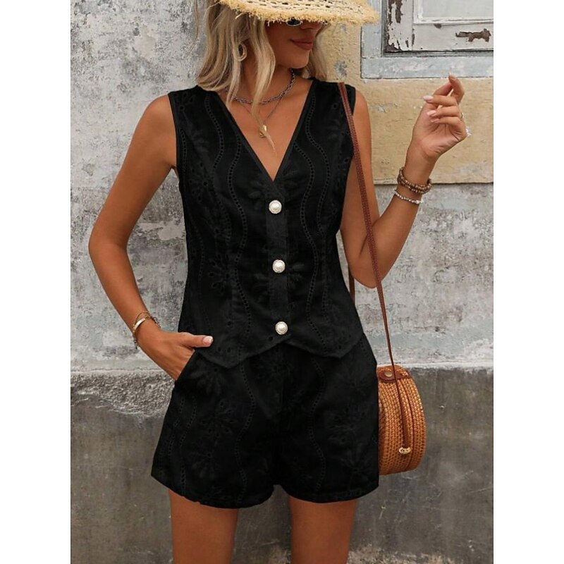 Women's Fashion Streetwear Daily Blouse Baggy Shorts Sleeveless Crew Neck Plain Hole Casual Daily Black White Army Green Summer Regular Fit 10