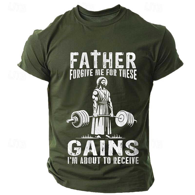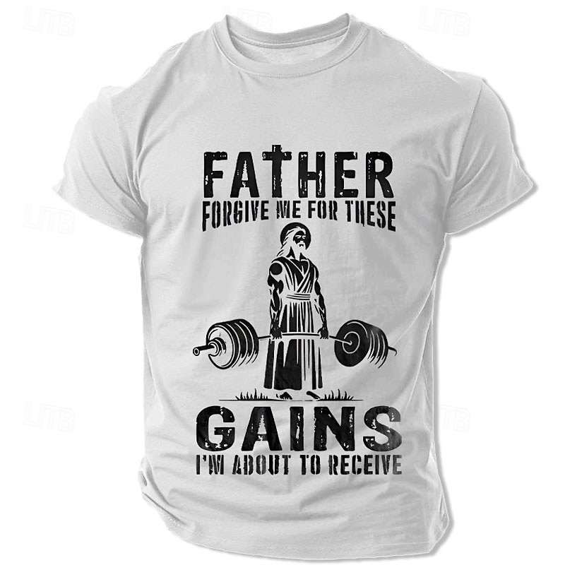 : Showcasing a humorous and bold graphic on the front, this T-shirt features a standout white print with a playful message: "Father forgive me for these gains I'm about to receive." Accompanied by a creative graphic of a weightlifting figure, this design merges fitness culture with a touch of humor, appealing to gym enthusiasts and fans of witty fashion alike.