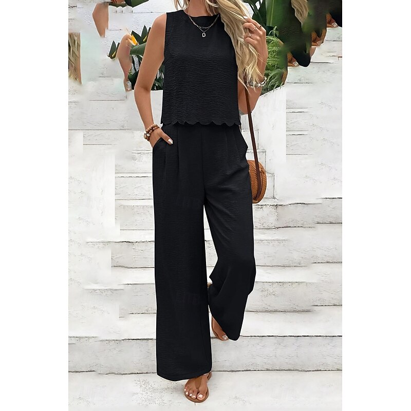 Highlights - Stylish and comfortable blouse - Versatile and trendy pants set - Classic crew neck neckline for a timeless look