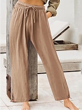 Highlights [Fabric] Crafted from high-quality polyester, these women's trousers offer micro-elasticity for added comfort and flexibility. The lightweight fabric ensures breathability, making them a perfect choice for breezy, warm weather during the spring and summer seasons. [Fit] Featuring a regular fit, these pants are designed with a wide-leg cut that allows for ease of movement and a relaxed, comfortable silhouette. The full-length design provides a laid-back yet stylish appearance suitable for various occasions. [Design Highlights] These trousers include thoughtful details such as an adjustable drawstring waistband for a secure and customizable fit, as well as convenient side pockets for added functionality. The versatile plain pattern in multiple colors like black, gray, purple, wine, blue, and khaki makes pairing with different tops effortless. [Occasions] Perfect for casual, daily wear, these pants are ideal for going out on weekends or enjoying a comfortable day at home. The simple yet elegant design makes them suitable for a range of settings, offering both style and comfort. [Size Range] Available in a wide range of sizes from S to 5XL, these trousers cater to a variety of body types, ensuring a perfect fit for everyone seeking stylish and comfortable apparel.