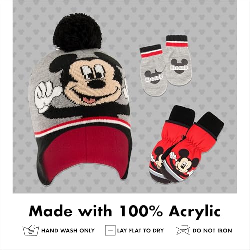 • THIS 3-PIECE SET INCLUDES: Mickey Mouse Scandinavian knit hat with soft fleece Lining, matching knit stretch mitten, and good quality insulated ski mittens. Featuring Mickey Mouse imagery on the front of the hat and ski mitten. Mickey Mouse gripper printing on the knit mitten. Great coverage for the head, ears, and little cute hands.