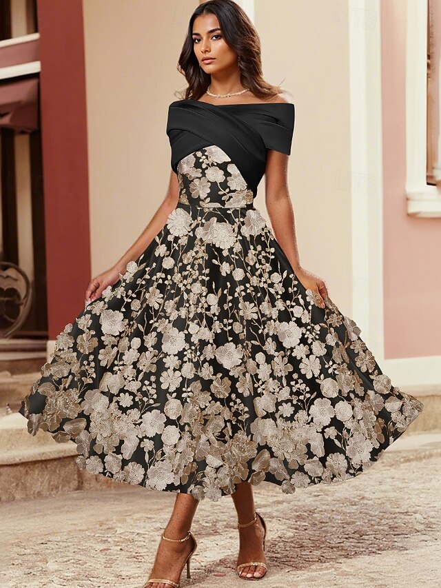 More information about A-Line CocktailDresses Elegant Dress Formal Wedding Tea Length Sleeveless Shirt Collar Satin with Pleats Ruched Embroidered Applique