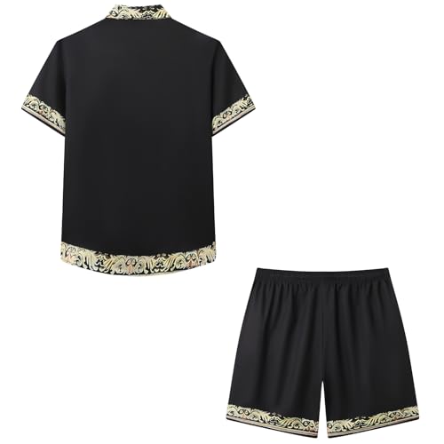 Men's 2-Piece Satin Short Set, Hawaiian Style Shirt and Shorts with Gold Trim, Black 1