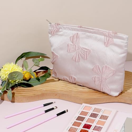 HOT ! Makeup Bag Large Capacity Elegant Bow Preppy Cosmetic Bag Aesthetic Design Canvas Zipper Organizer Pouch Cute Roomy Pink Portable Toiletry Bag for Women Girls Travel Storage Accessories