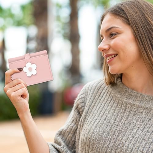 Cute Small Wallet for Teen Girl Trifold Wallets for Women flowers PU Leather Small Wallet Mini Leather Cash Pocket Card Holder Purse with Buckle & Clear ID Window(Pink) 1