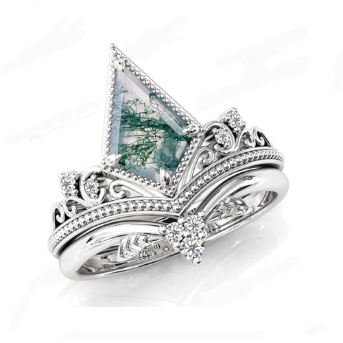 Natural Moss Agate Engagement Black Ring Set for Women 925 Sterling Silver Genuine Green Moss Agate Bridal Rings Set for Her with Engraving Moss Agate Promise Wedding Ring Set Size 4-15 7