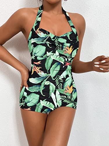 HOT ! Women's Retro Tummy Control Swimsuits Halter One Piece Slimming Swimwear,Vintage Boyshorts Ruched Push Up Bathing Suit