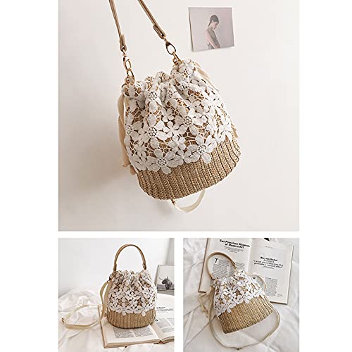 Rcheommo Women Cross Body Bohemian Straw Bag Straw Drawstring Bucket Straw Bag Flower Lace Decor Handwoven Rattan Ba