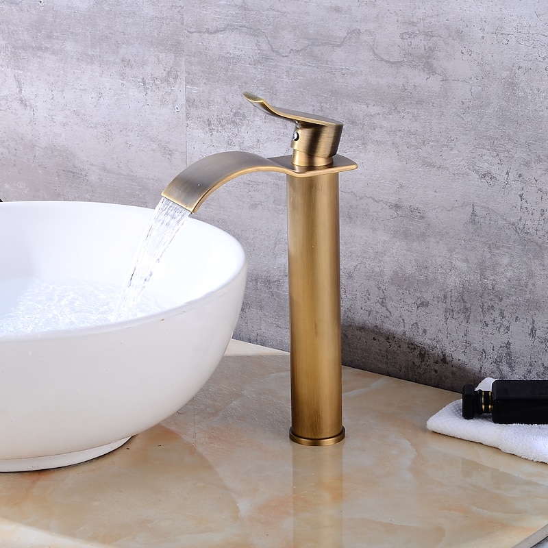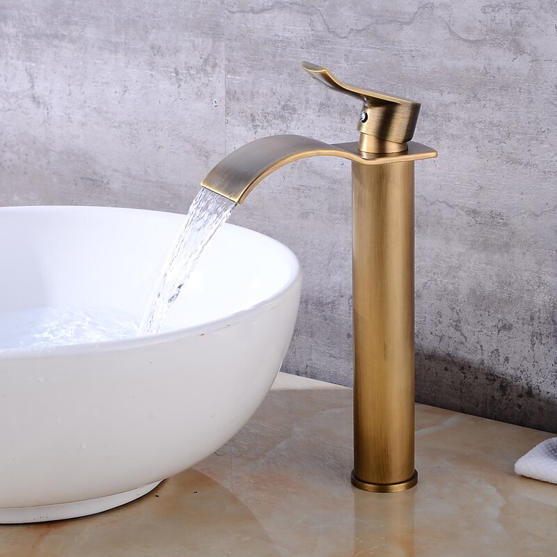 HOT ! Antique Copper Bathroom Sink Faucet,Golden Waterfall Single Handle One Hole Bath Taps with Hot and Cold Water Switch