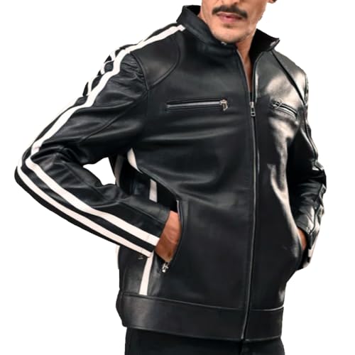 More information about Mens Black Cafe Racer Vintage Motorcycle White Stripes Leather Jacket Retro Biker Leather Jacket