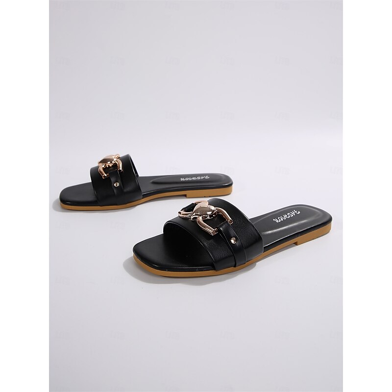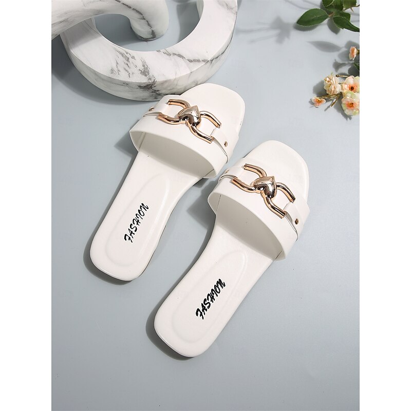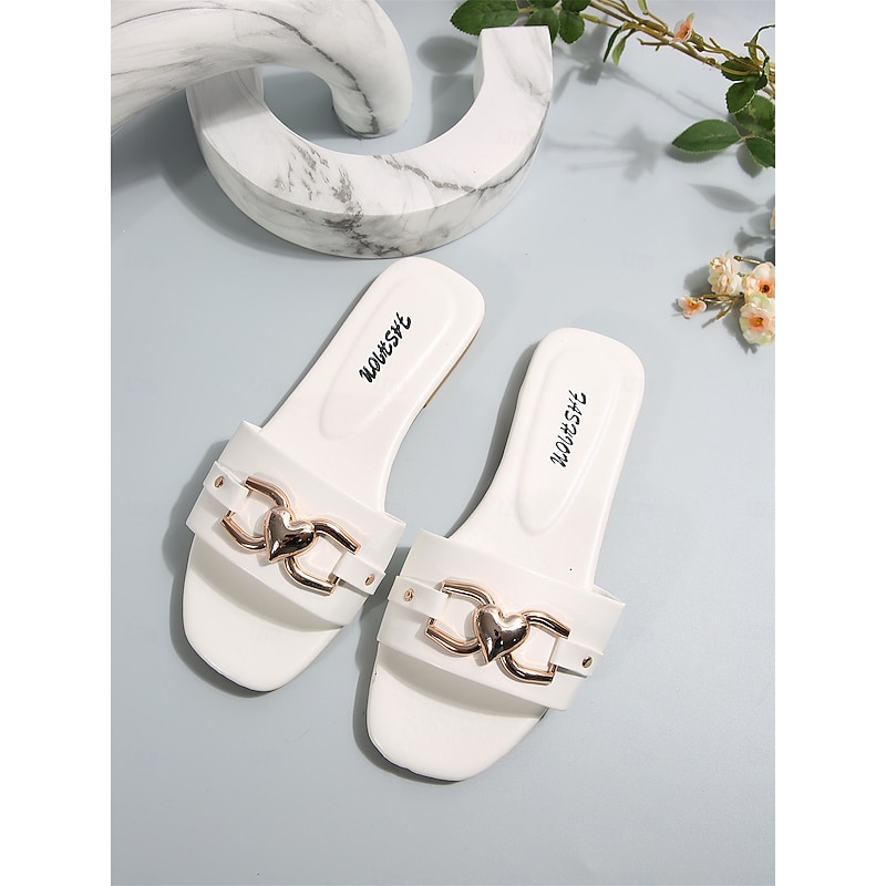 HOT ! Women's White Slide Sandals with Heart-Shaped Metal Buckle – Casual Summer Footwear for Beach, Vacation and Everyday Style