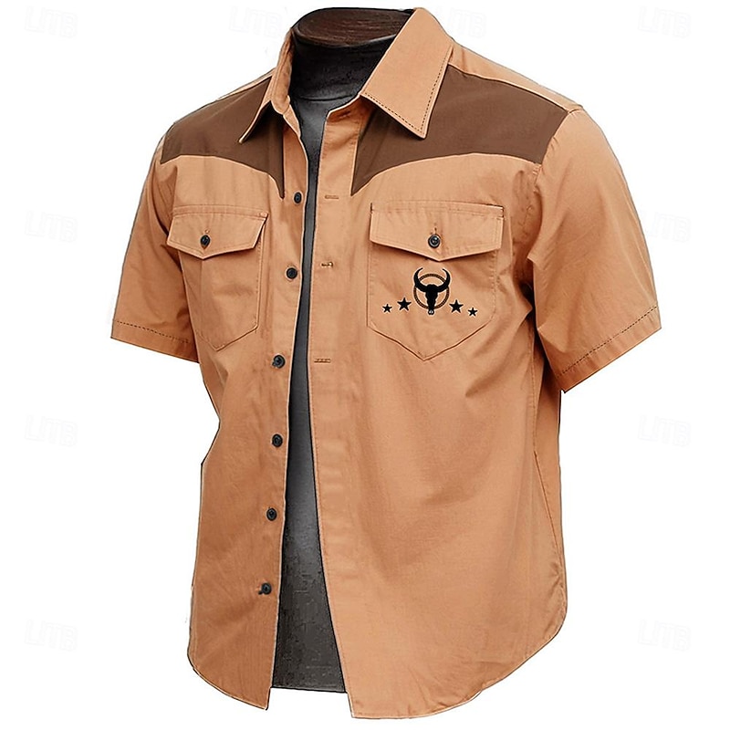 Highlights [Fabric]: Crafted from a lightweight, breathable polyester, this men's short-sleeve shirt is perfect for keeping cool and comfortable during spring and summer days. The fabric’s micro-elasticity ensures a relaxed fit, making it suitable for outdoor activities. [Fit]: Designed in a regular fit, the shirt offers a balance of ease and style, allowing for comfortable movement while maintaining a neat and polished appearance. [Design Highlights]: Featuring a distinctive cow print pattern, this shirt's vintage western style is enhanced by its turndown collar and a striking bullhead logo adorned with stars. Dual buttoned chest pockets combine practicality with a rugged aesthetic, while brown detailing on the shoulders and upper chest adds contrast to the classic primary color options of brown, green, and khaki. [Occasions]: Ideal for sports and outdoor activities such as camping and hiking, as well as casual outings. Whether you're exploring the great outdoors or enjoying a casual day out, this versatile shirt complements a variety of occasions. [Size Range]: Available in a wide range of sizes from S to 3XL, catering to adults who appreciate vintage and western styles in their casual, everyday wardrobe.
