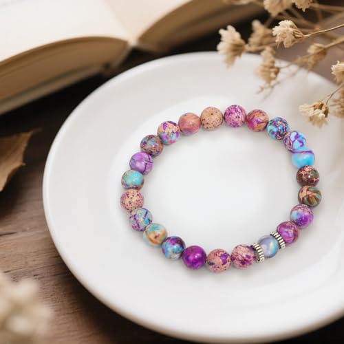 • Beaded Bracelets for Women Teen Girls: crafted with purple imperial jasper and moonstone beads, the natural stone is believed to reduce anxiety stress (emotional balance), absorb negative energy (protection and purification), promote inner peace, strengthen one’s aura, enhance spiritual growth and higher awareness, symbolize love passion hope loyalty wisdom confidence strength power, attract wealth opportunity good luck success, energy healing, maintaining calm under pressure.