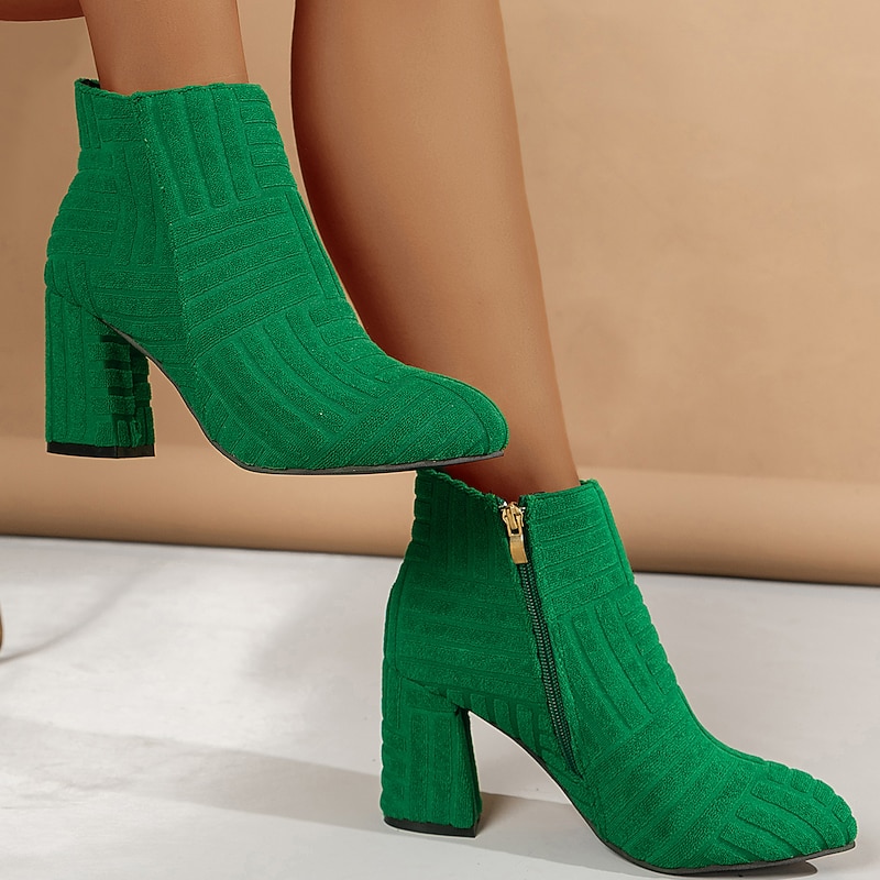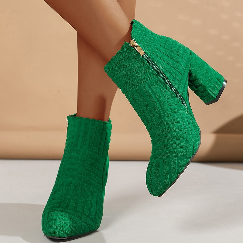 Highlights [Fabric & Design] These women's boots are crafted from high-quality polyester material, showcasing a textured fabric with a unique ribbed pattern that adds style and sophistication. The appearance of soft suede or velvet provides a luxurious touch to the vivid green ankle boots. [Design Highlights] Featuring a convenient metallic finish side zipper, these boots are easy to wear, offering a sleek and modern touch. The chunky heel ensures stability and comfort, suitable for all-day wear, while the pointed toe design contributes to an elegant and stylish silhouette. [Fit & Style] These boots are designed with a versatile and casual style, perfect for daily wear. The chunky heel is less than 1 inch in height, offering a balance of comfort and trendy appeal. The pointed toe shape highlights the boot’s elegant features. [Occasions] Ideal for fall and winter, these boots are perfect for daily wear, whether for daytime activities or an evening out. Their stylish design makes them a great choice for adding a fashionable touch to any outfit, suitable for various casual settings. [Size Range] Available in a wide range of sizes including US sizes 6 to 10.5, these boots cater to diverse shoe size needs, ensuring a suitable fit for many customers. Choose from bold color options such as orange and green to match your personal style.