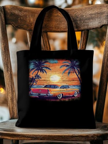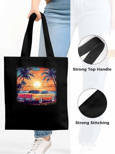 HOT ! Canvas Tote Bag, Beach Palm Tree Car Sunset Orange Sky Aesthetic Canvas Tote Handbags for Women Shoulder Bag,
