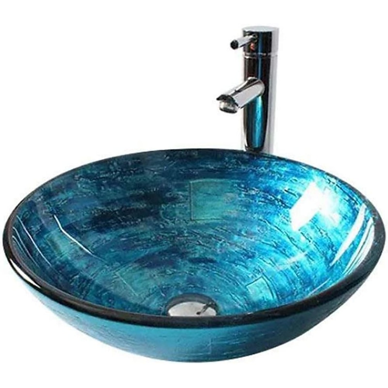 Round Artistic Vanity Basin Sink Bathroom Vessel Tempered Glass Bowl 16.5 inch, Art Wash Basin Mixer Faucet Set with Pop-up Drain, Boat Shape Countertop Above Counter Washroom 1