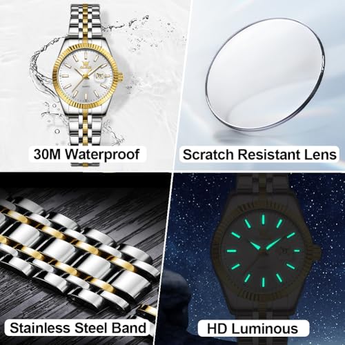 OLEVS Women's Stainless Steel Watch, Luxury Gold Silver Two Tone Easy to Read Analog Quartz Dress Watch for Women, Elegant Waterproof Luminous Calendar Date Ladies Watches for Small Wrists 1