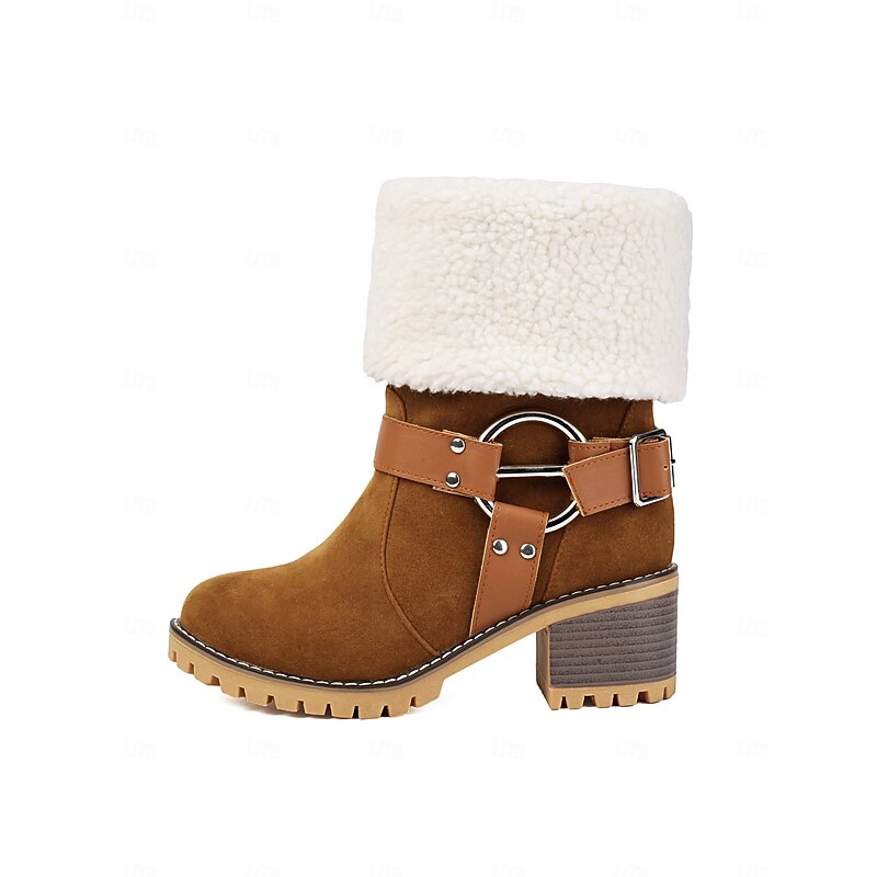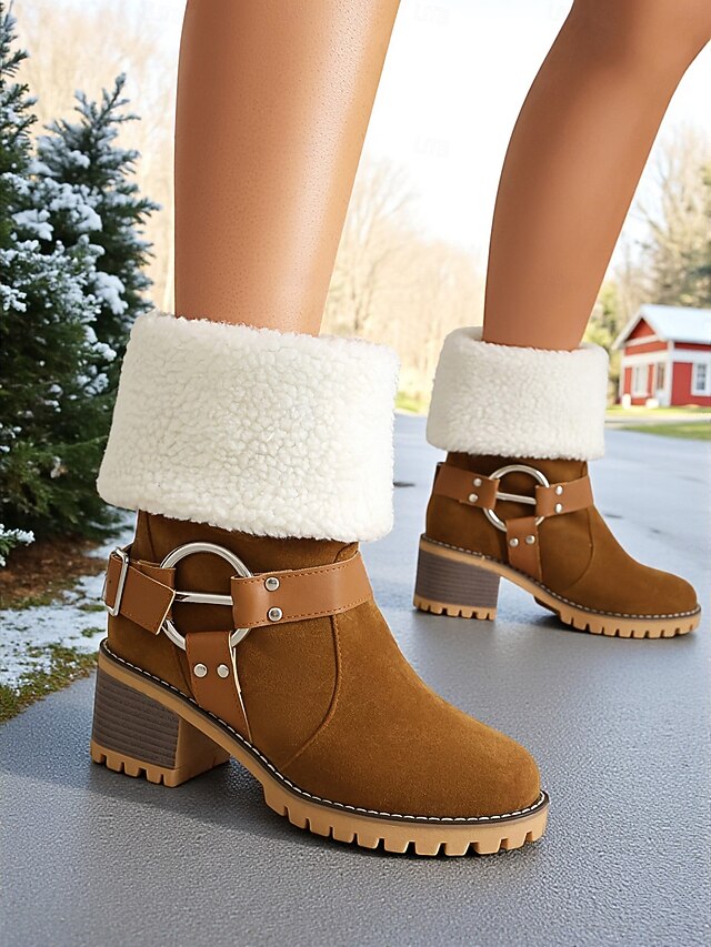 Women's Faux Suede Ankle Boots with Shearling Cuff and Buckle – Casual Winter Chunky Heel Boots for Outdoor, Travel and Cozy Outfits 19