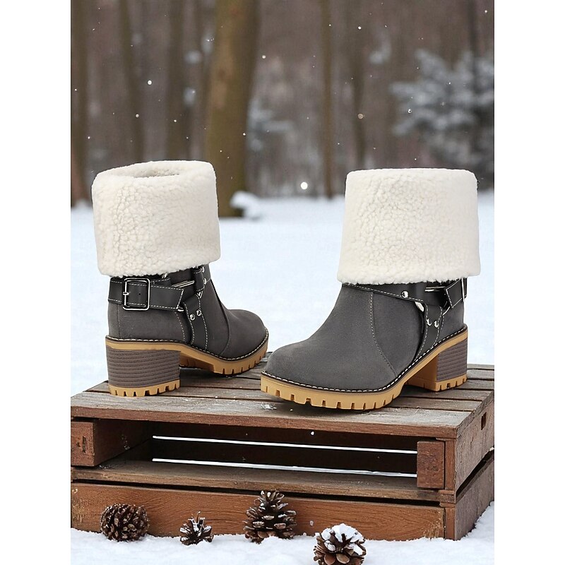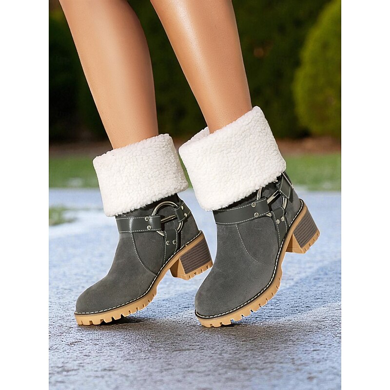 HOT ! Women's Faux Suede Ankle Boots with Shearling Cuff and Buckle – Casual Winter Chunky Heel Boots for Outdoor, Travel and Cozy Outfits