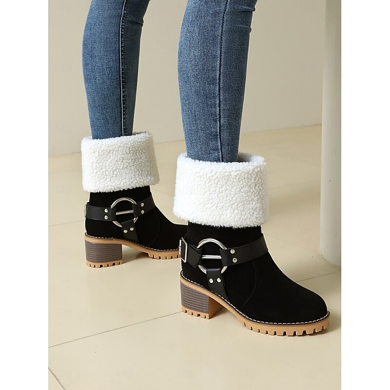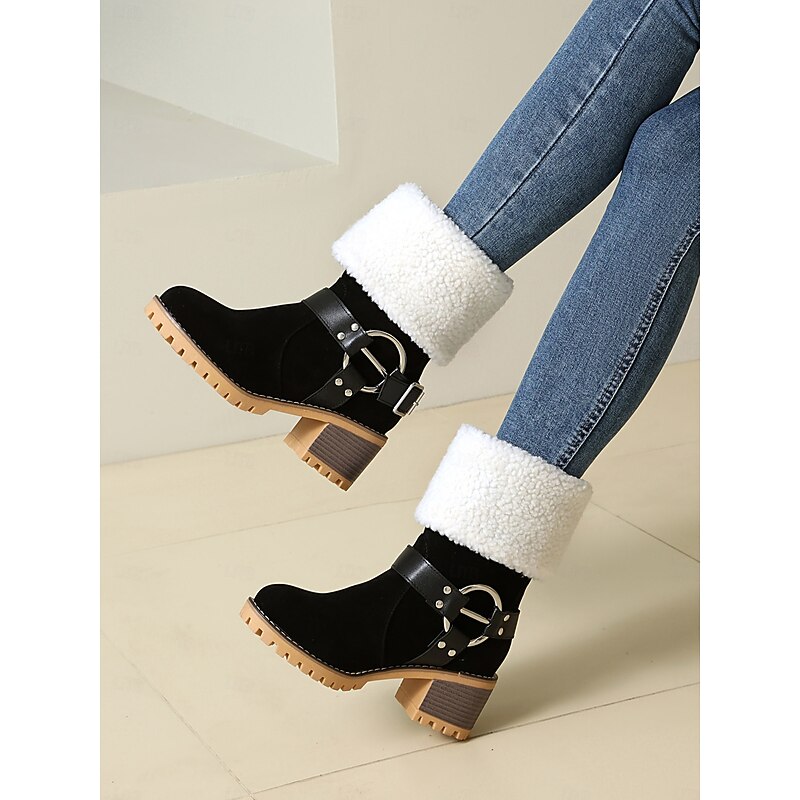 Women's Faux Suede Ankle Boots with Shearling Cuff and Buckle – Casual Winter Chunky Heel Boots for Outdoor, Travel and Cozy Outfits 4