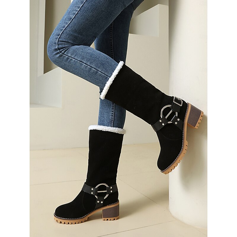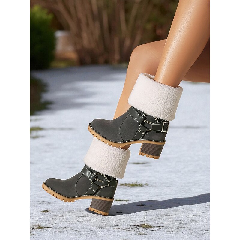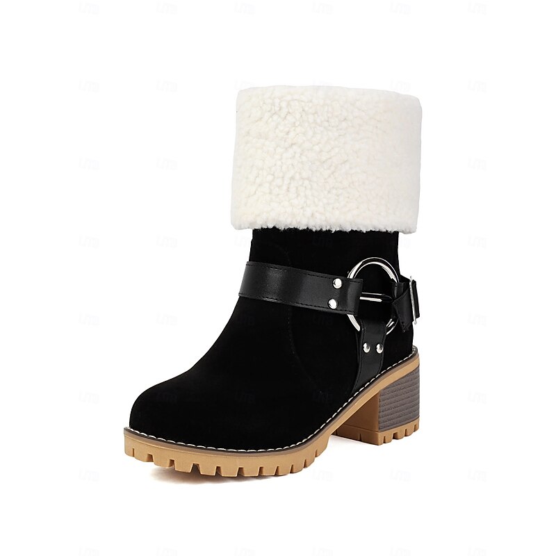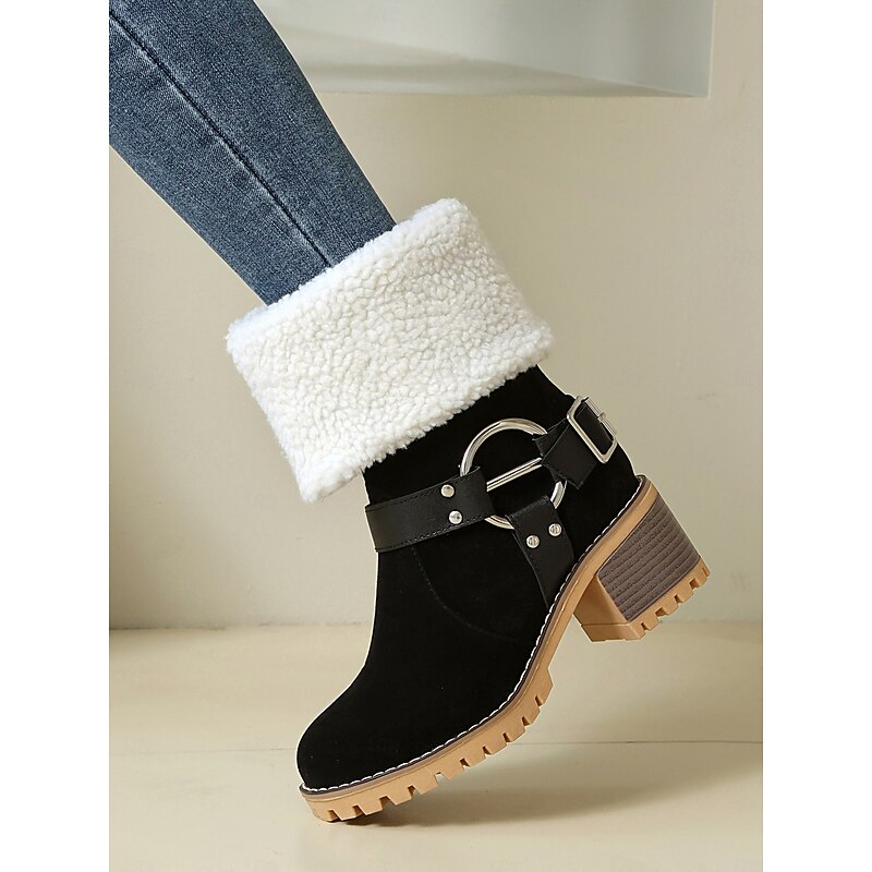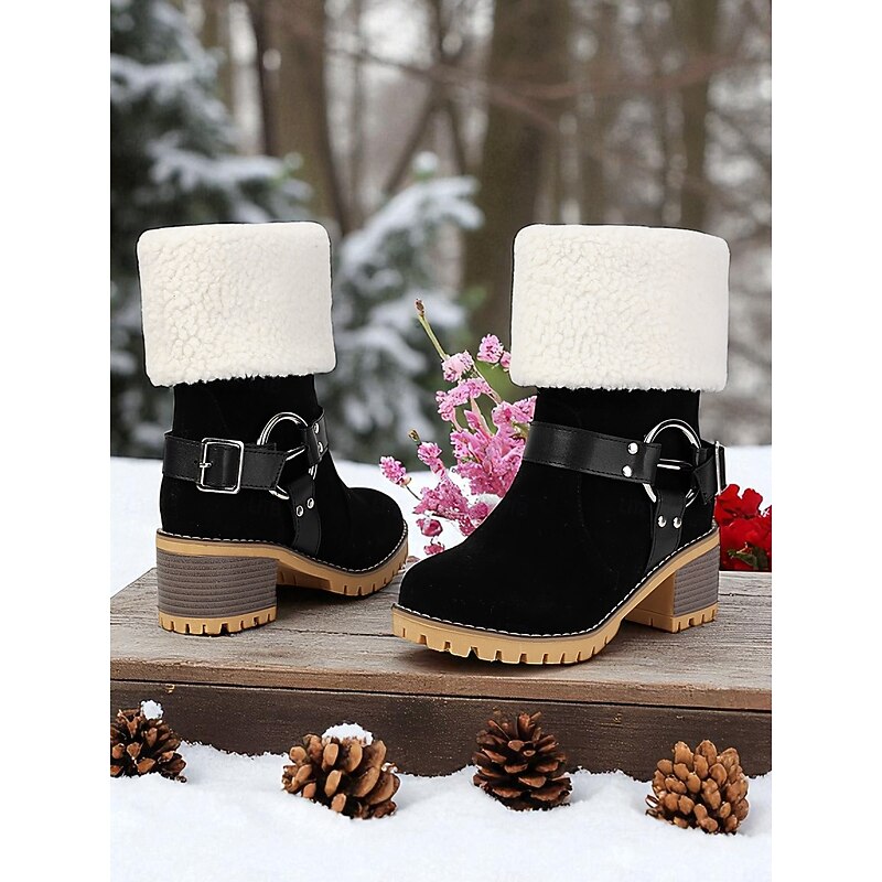 Women's Faux Suede Ankle Boots with Shearling Cuff and Buckle – Casual Winter Chunky Heel Boots for Outdoor, Travel and Cozy Outfits 1