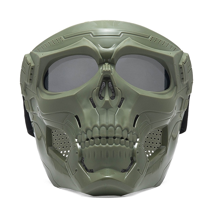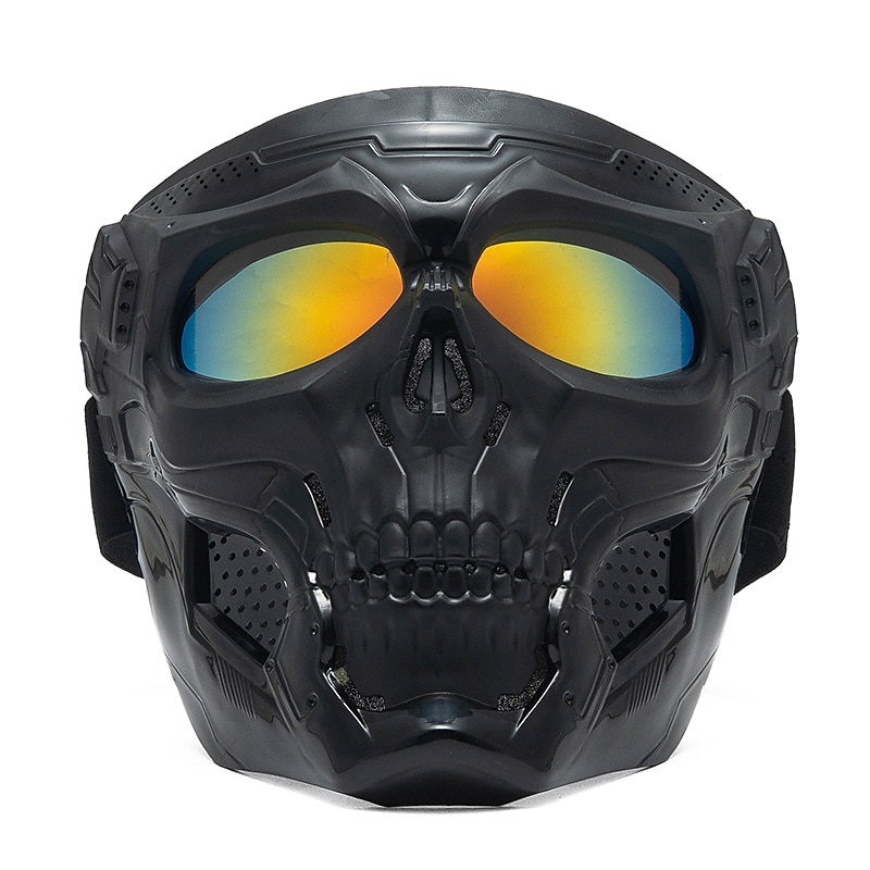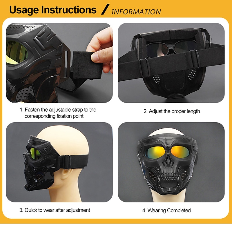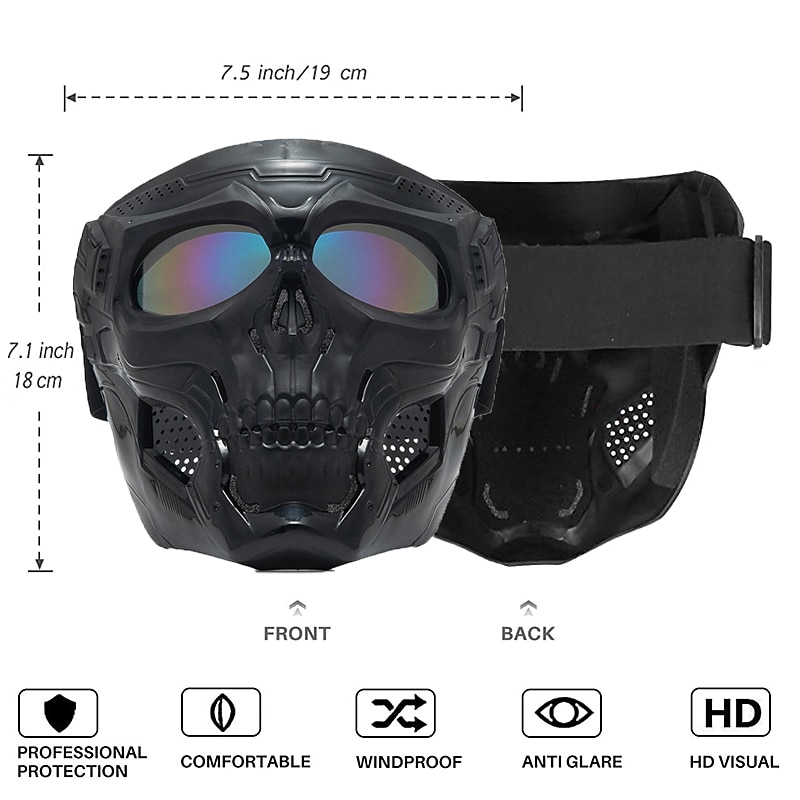 Highlights 1. High-quality Materials: These motorcycle goggles masks are made of ABS frames and impact-resistant high-definition PC lenses to provide you with high transparency and a wider field of view. 2. Versatile Design: The forehead of the skull face mask is not completely covered, making it ideal for use with a variety of different helmets, including those for motorcycles, half helmets, and other types of headgear. This feature allows for safe and comfortable protection while riding your motorcycle. 3. Comfortable Fit: The high-quality sponge filler effectively cushions facial pressure, and the high-density sponge fits the face for a comfortable wearing experience. You won't have to worry about your face feeling uncomfortable, even after wearing the goggles for an extended period of time. 4. Adjustability: Equipped with an adjustable high elastic band, these goggles can fit most sizes of head for a comfortable wearing experience and optimal protection. 5. Perfect Protection: Our goggles mask provides perfect protection for both your face and eyes. Whether you're riding a motorcycle, biking, mountain climbing, or attending a Halloween party, these goggles will keep you safe and comfortable.