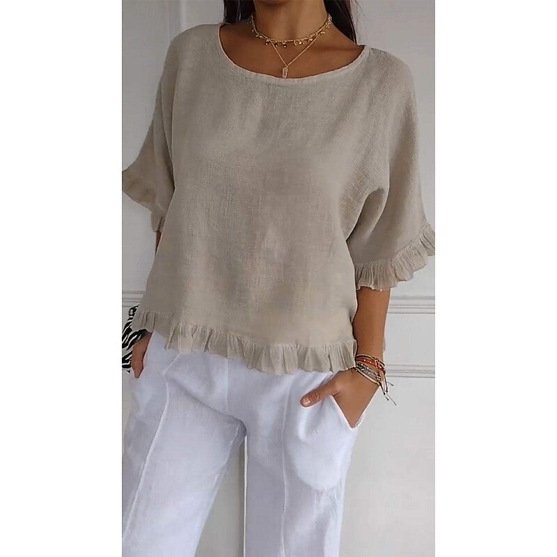 HOT ! Women's Cotton Linen Blouse Solid Color Stylish Casual Half Sleeve Crew Neck Regular Tops Daily Holiday Ruffle Summer