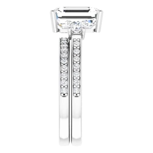 • Main Stone: Moissanite, Main Stone shape: Emerald Brilliant Cut, Main Stone Color: Colorless, Main Stone Clarity: VVS1, Main Stone Luster: Excellent, Main Stone Weight: 3 CT Approx, Side Stone: Round Brilliant Cut, Side Stone Color/Clarity: White/VVS1, Side Stone Weight: 0.30CT Approx, *** Description of Band:- Stone Shape: Round Brilliant Cut, Luster: Excellent, Stone Color/Clarity: White/VVS1, Stone Weight: 0.20CT Approx, Type: Handmade Ring Set, Setting Type: Prong Setting